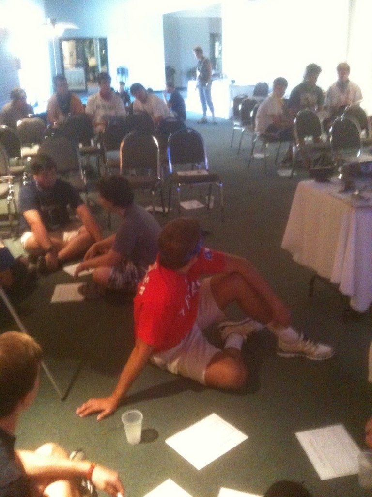 The first activity involved being blindfolded and walking through the ranch next to a fellow pal. The catch was that we were not allowed to talk. Only hand claps and touching could be used to communicate with our pal. This particular exercise showed everyone the importance of good communication and trust. Dan Morris, skeptical at first, enjoyed the activity, saying, “I was scared at first, but my partner had a strong grip on me and it made me feel safe and comfortable.”