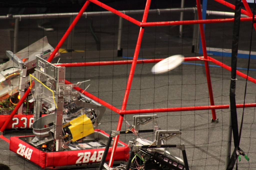 This year’s competition style, Frisbee shooting, was an interesting and difficult task to accomplish. Competitors were required to build a team of robots able to pick up Frisbees, load them into a shooting mechanism, and launch them into small rectangular openings in a wall on one side of the arena. Robots shot Frisbees using preprogrammed codes, as well as manual shooting programmed by one of the students. After target shooting, teams were awarded up to 30 points for however many levels their robot could climb on a 3 level metal-barred structure. Many different styles and structures of robots were seen this year as Jesuit traveled to Lubbock and Oklahoma. Jesuit managed to craft themselves some of the competition’s best robots to compete against other tough schools.