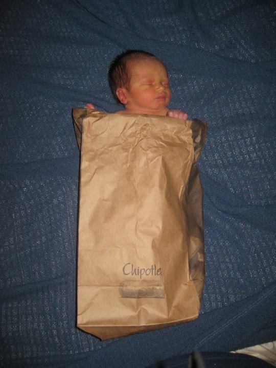 Following this up, “nine months later when [Mr. Blackwell’s] son was born,” he tested the theory that “a small child is the same size as a burrito,” by putting his son “in a Chipotle Burrito Bag.” Afterwards, the conclusion was unambiguous, “babies are a little bit bigger.”