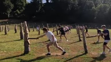 We are using wooden swords against a post practicing fighting techniques (Ms. Kopek)