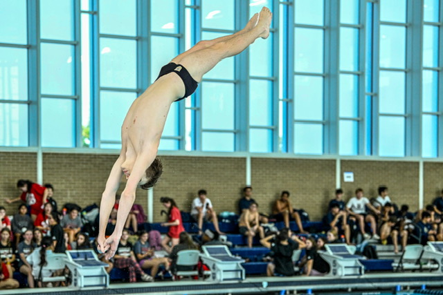 “A standard high school diving meet consists of six dives–one voluntary dive and five optional dives–selected from four of the five categories: front, back, reverse, inward, and twisters. The voluntary dive is generally the simpler dive from the category such as a basic dive or a 1.5 somersault as they carry a lower Degree of Difficulty (DD). Optional dives are more advanced and typically have the higher DD value on a diver’s list such as a 1.5 somersault or more complex such as double somersaults. Divers may not repeat any dive during the meet.