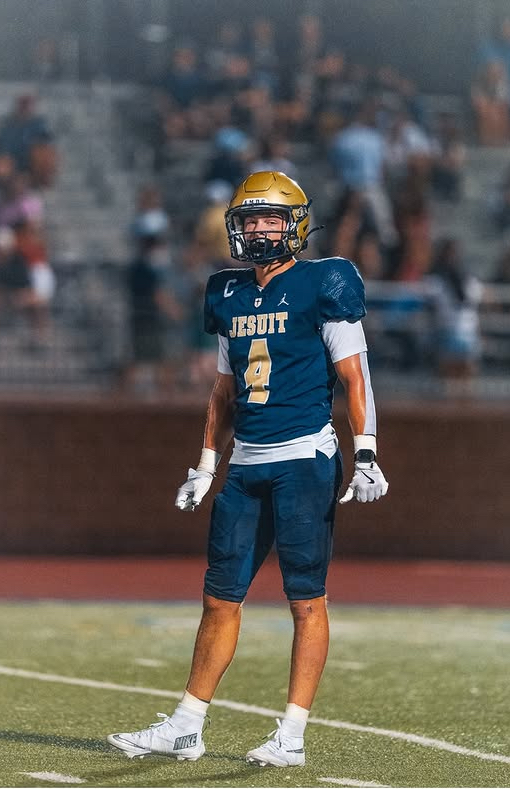 On the opposite side of the ball, the Jesuit defense forced a turnover which was the 15 yard pick-six by Joe Norman. Linebacker Cole Wombacher ’26, once again, led the team in tackles with 5, 3 assisted and 2 unassisted; Cabe Weissmueller ’26 trailed right behind with 3. Jesuit had four tackles for a loss, 2 from Cole Wombacher, .5 from Joe Norman, and .5 from Cole Johnson ’27.