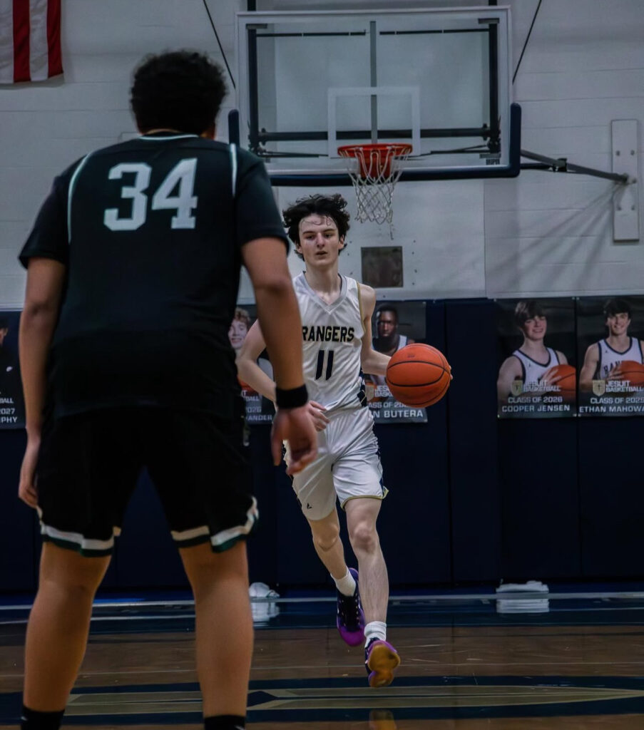 Jesuit guard Jack Sisk ’27 (#11) takes the ball up the court during a Junior Varsity basketball game. Photo Credit: @_archer.media_ on Instagram