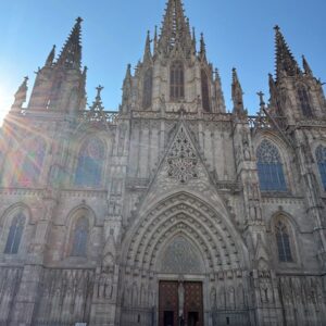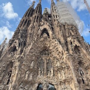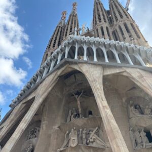 Perhaps the most famous church in all of Barcelona is the colossal La Sagrada Familia Basilica. The church is still under construction but once it is complete it will be the tallest church in the world. The exterior has three enormous facades: the passion facade, the nativity facade, and the glory facade (the last one has not been built as of February 2026). The passion facade depicts Jesus’ passion, death, and burial, and is very plain with massive columns resembling human ribs holding the structure up.